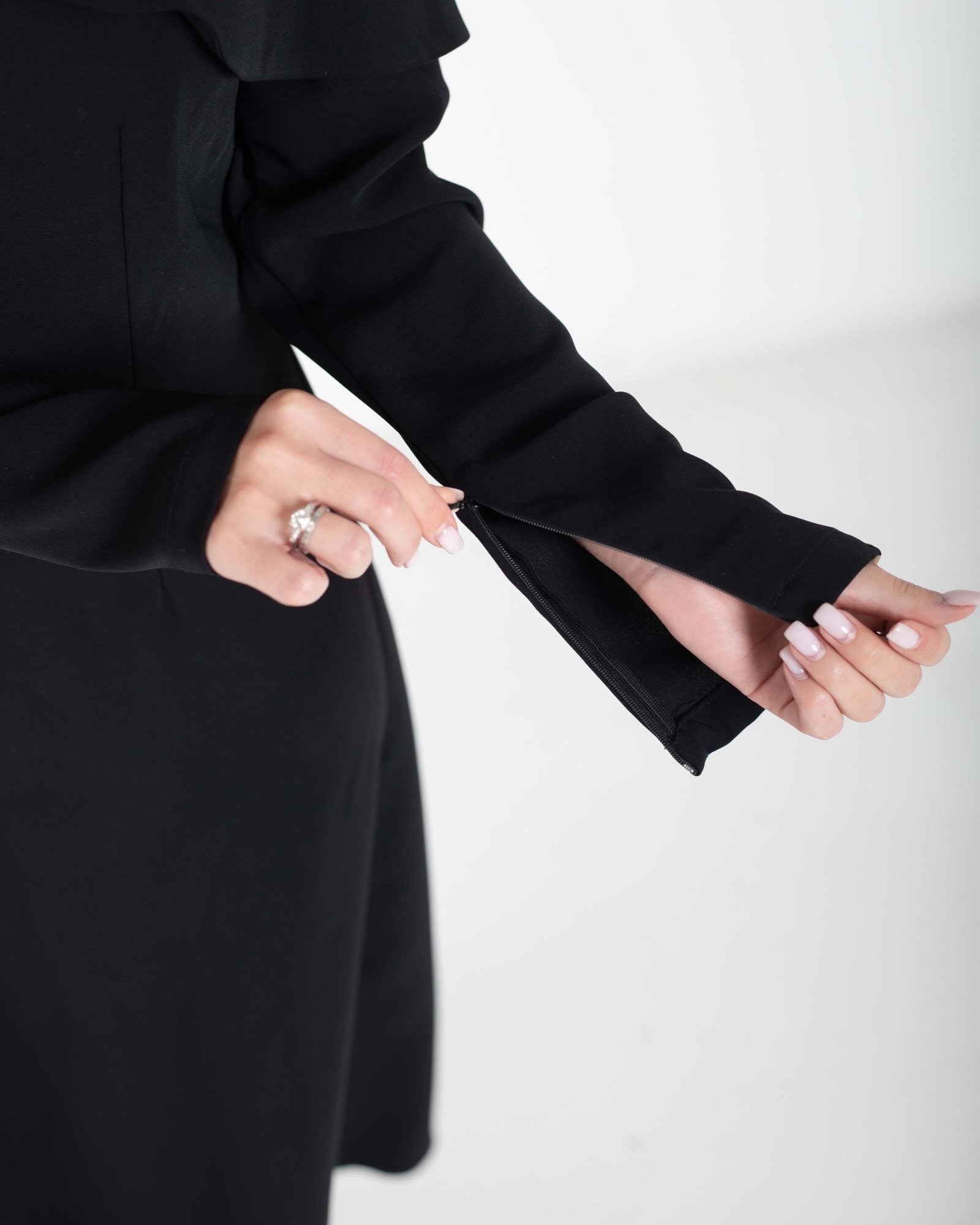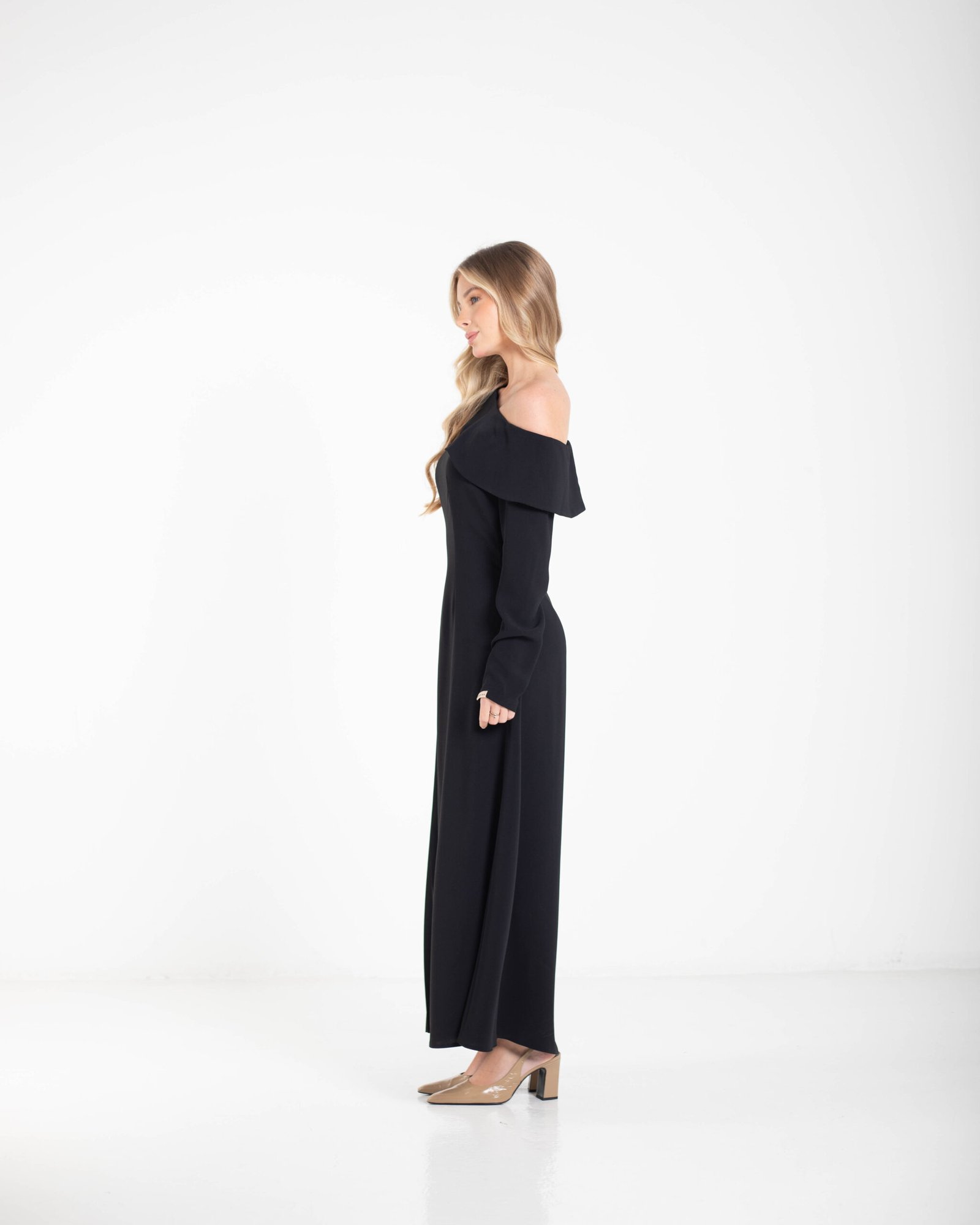 The NUIT Off Shoulder Dress is an all-time classic reimagined. Crafted in timeless black, this elegant midi dress features a striking off-shoulder neckline that reveals just the right amount of skin. A softly draped bodice and refined pleated detail at the hip create a sculpted silhouette with a modern twist. Discreet zippers at the sleeves add a playful, unexpected touch, making this dress as versatile as it is sophisticated. The perfect blend of allure and elegance.